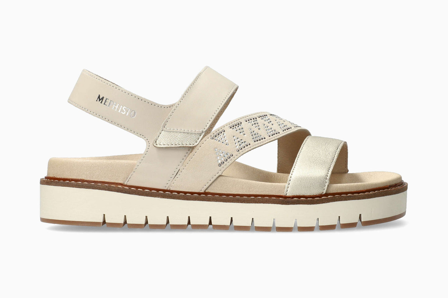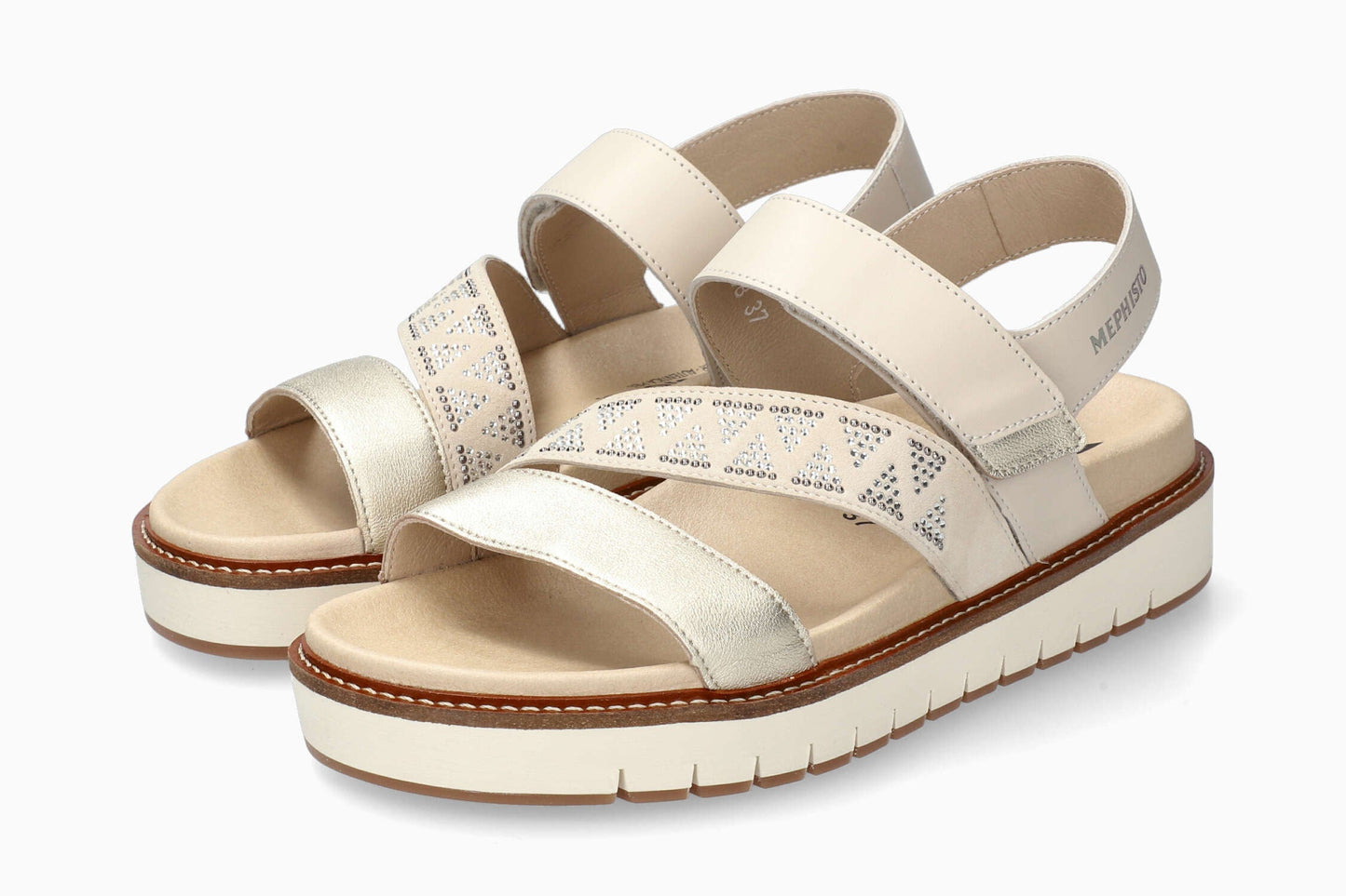 This lightweight sandal is a treasure trove of femininity, thanks to its rhinestones which give it a very dressy look. The SOFT-AIR midsole and the SHOCK-ABSORBER, integrated in the outsole, minimise impact for a gentle, effortless walk. The AIR-RELAX technology respects the anatomy of the foot to prevent fallen arches. The adjustable adhesive strap ensures an excellent fit. Its leather lining promotes a healthy climate inside the shoe.