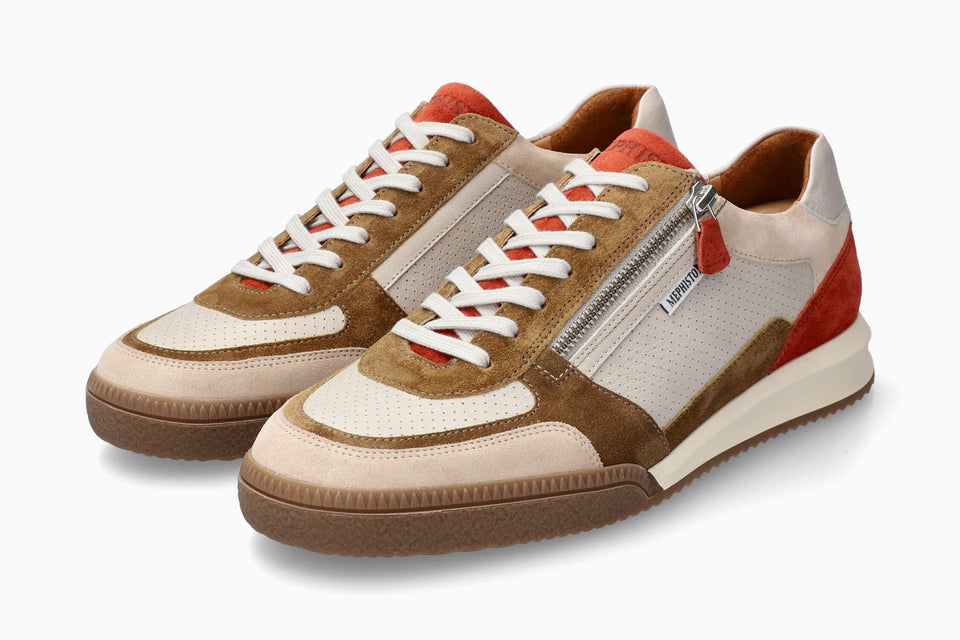 This sneaker has a sporty design and a great fit, giving it an elegant and original look. The SOFT-AIR midsole and SHOCK-ABSORBER help reduce shock to a minimum for a smooth, fatigue-free ride. AIR-RELAX technology respects the anatomy of the foot to prevent arch collapse. In addition to lacing, a side zip makes it easy to slip into the shoe without effort. The genuine leather lining guarantees a high standard of quality and comfort. This beige model for men features suede leather over the entire foot and smooth leather on the sides and forefoot.