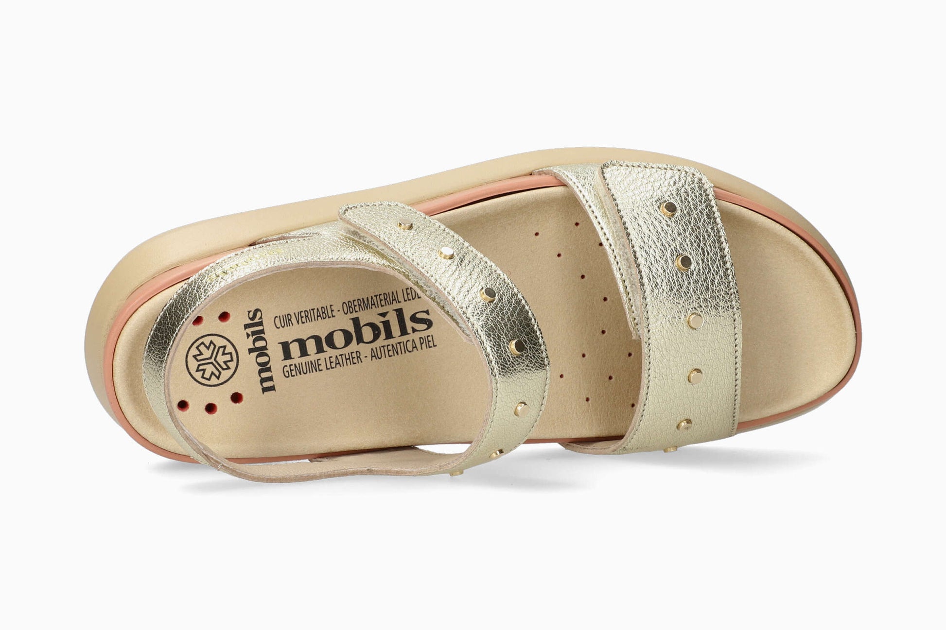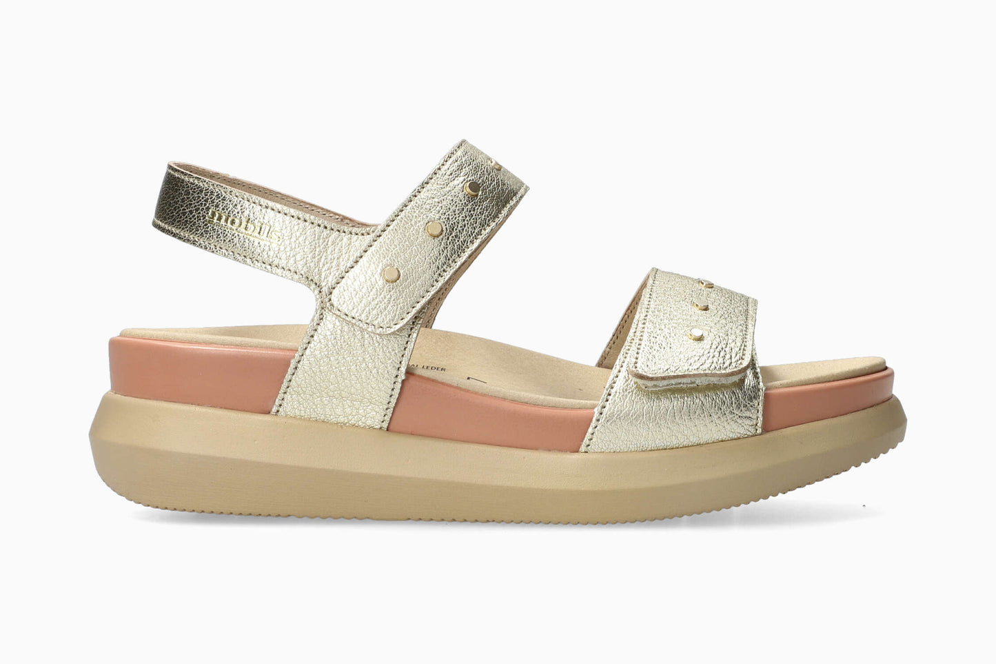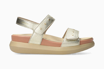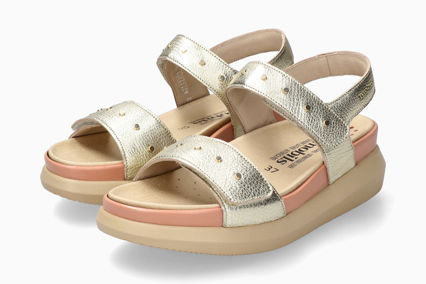 This trendy sandal is a jewel of femininity thanks to the rivets that give it a very dressy look. The removable insole with SOFT-AIR technology and the outsole with SHOCK-ABSORBER reduce impact to a minimum, ensuring you walk smoothly and without fatigue. Its INTEGRAL MATTRESSING provides additional comfort. Adjustable hook-and-loop straps ensure a perfect fit. Leather lining with a touch of textile for perfect foot support. This metallic-look sandal for women is made from smooth grained leather.