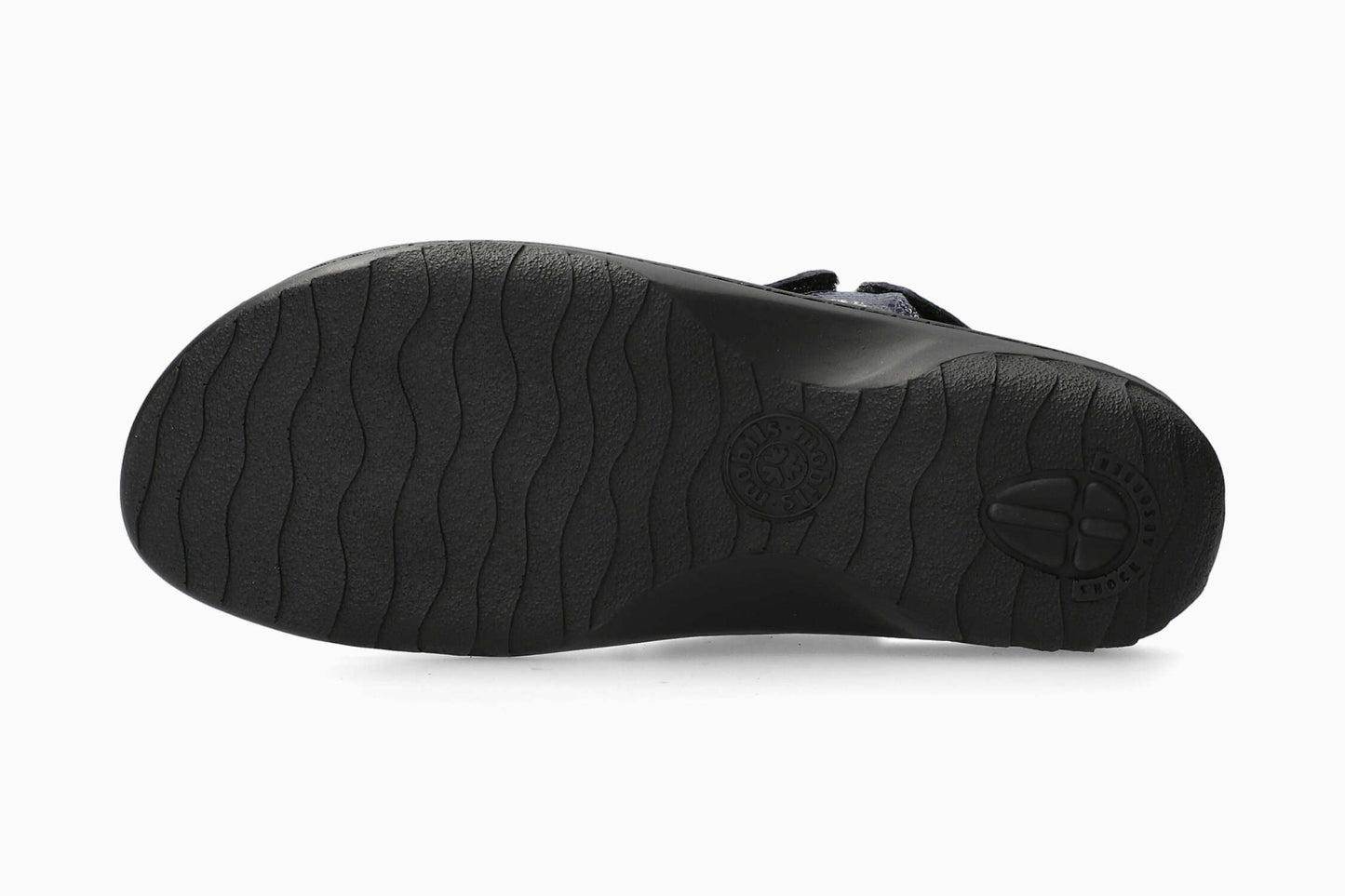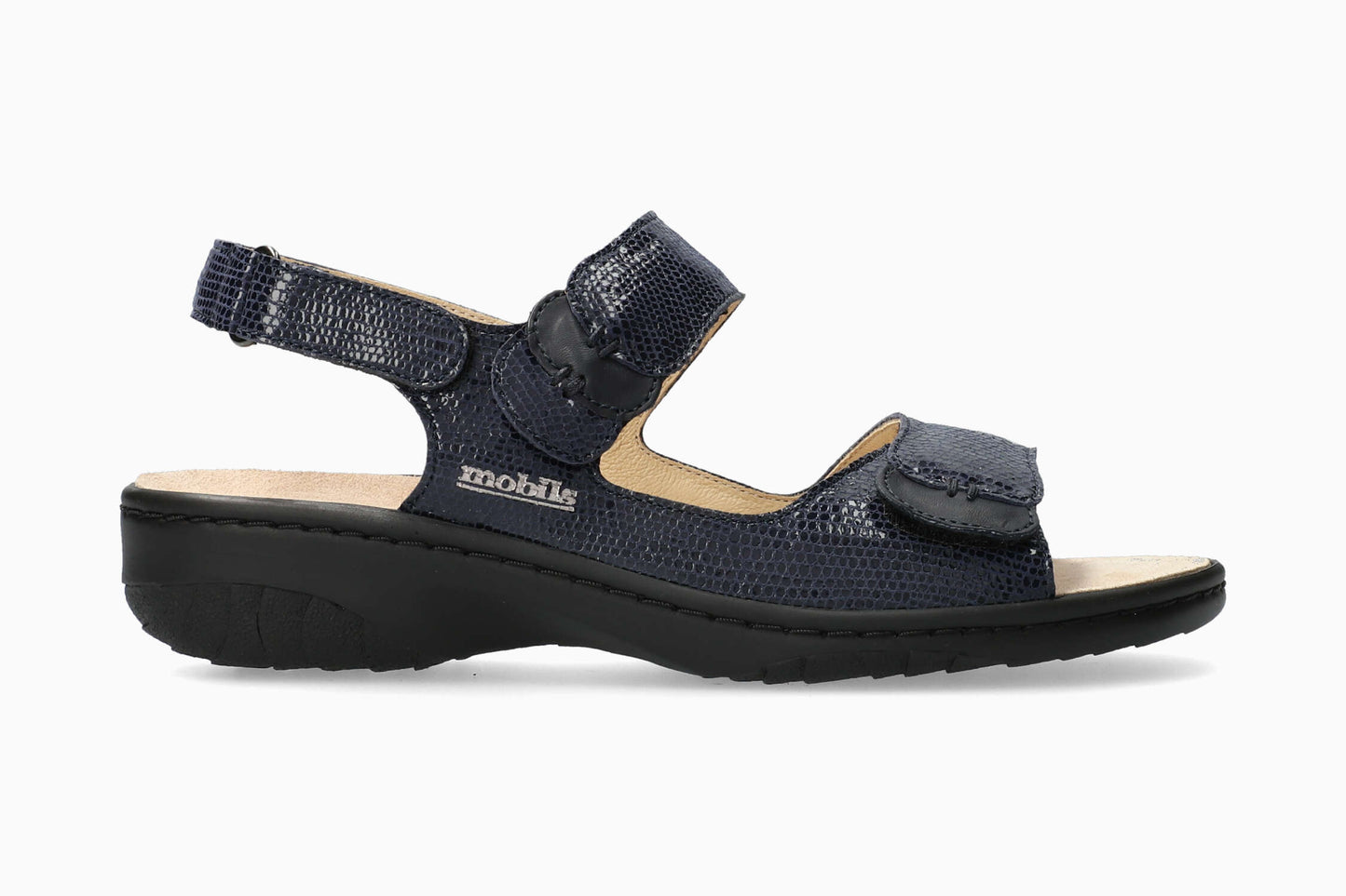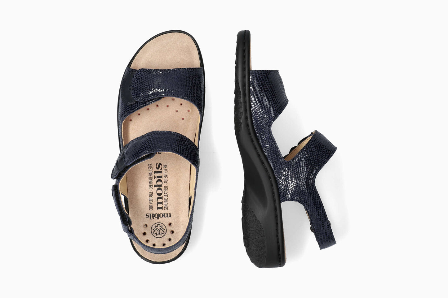 This ultra-lightweight sandal guarantees optimum comfort. The detachable cork insole, with integrated SOFT-AIR Technology, and the SHOCK-ABSORBER, in the outsole, minimize impact for an effortless walk with a spring in your step. Its INTEGRAL CUSHIONING promotes an enhanced sense of well-being. It guarantees an ideal fit, thanks to the adhesive straps across the instep. The leather lining ensures good foot hygiene. This blue model for women is made of glittery metallic-effect leather all over the foot and smooth leather on the toe straps.