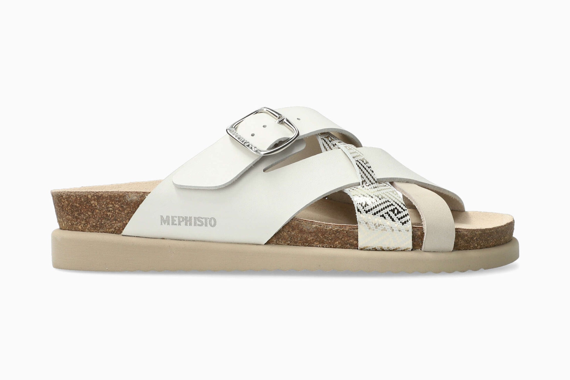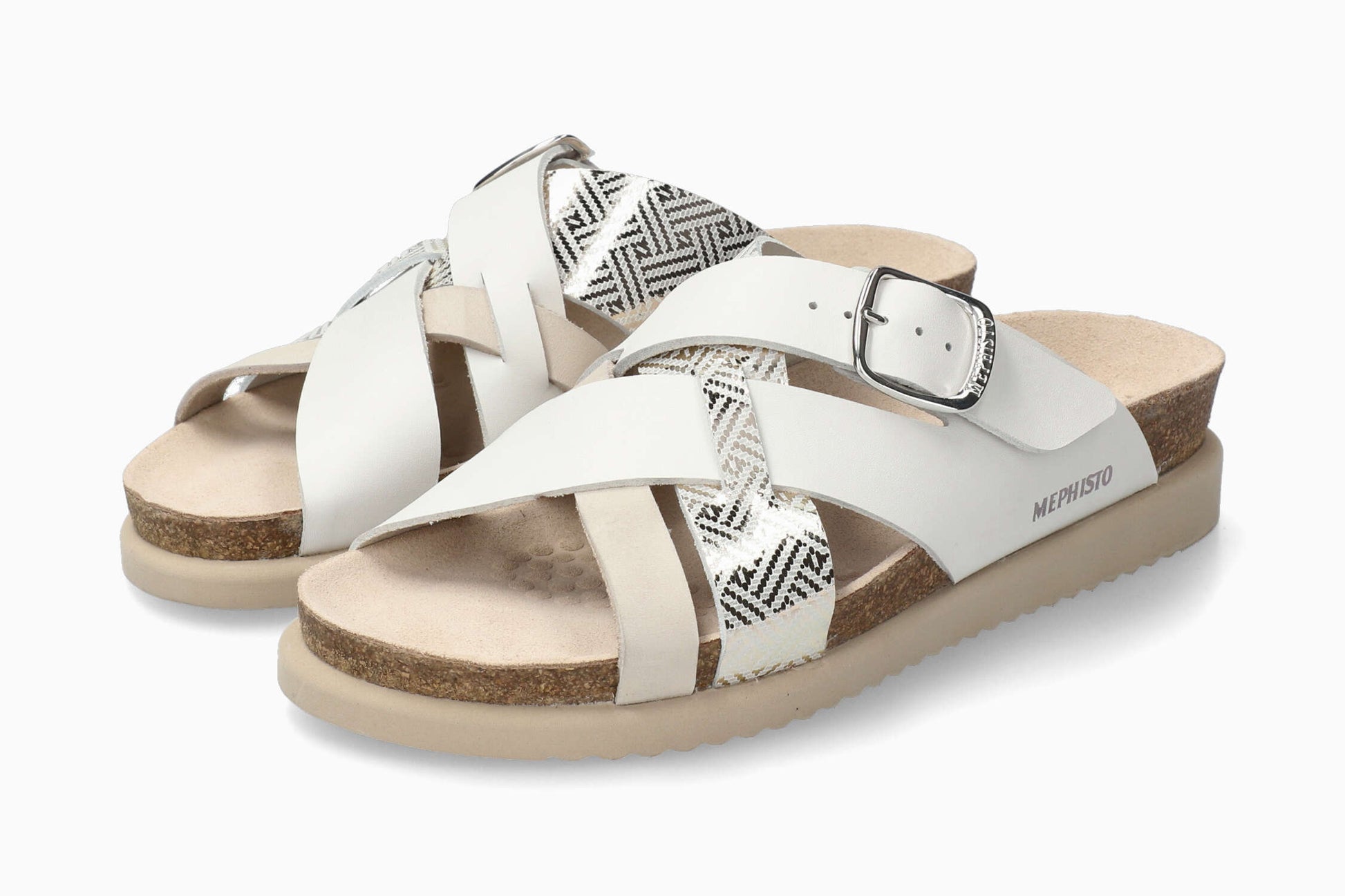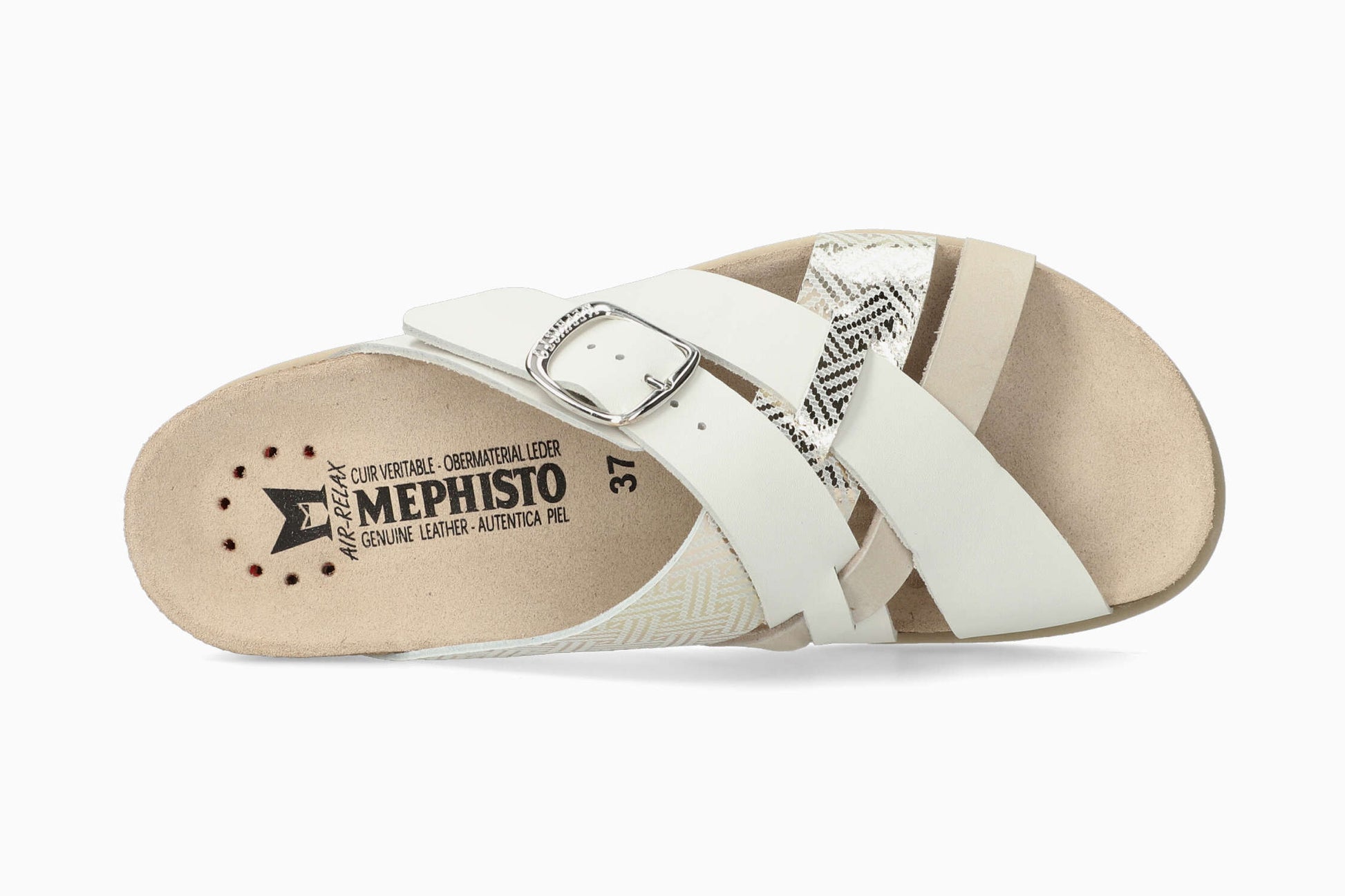 Easy to slip on and comfortable, our HIDA sandal will suit all your needs. This cream-colored women's model is made of smooth leather over the entire foot with patent leather and metallic-effect leather inserts with a fantasy print.