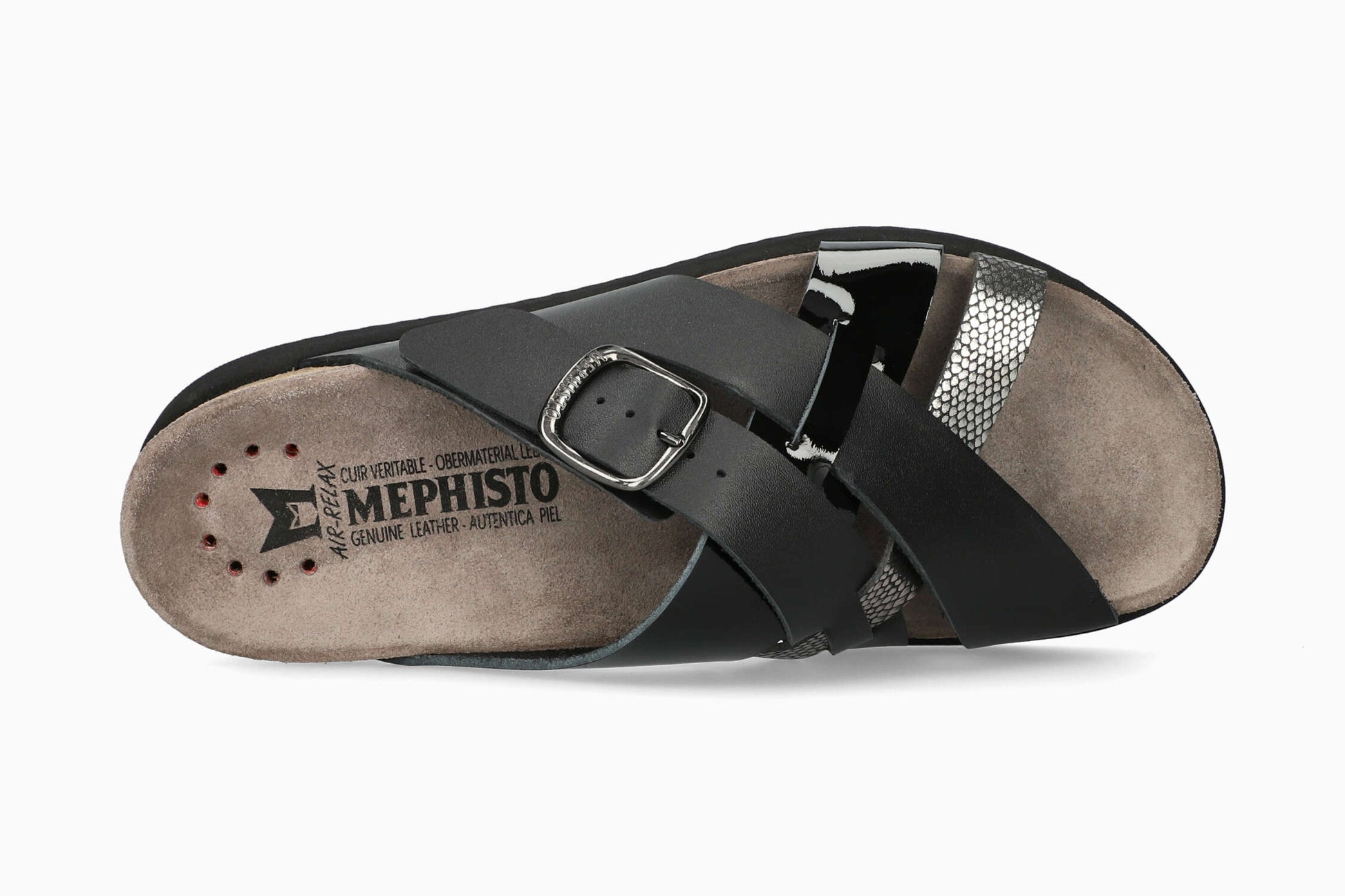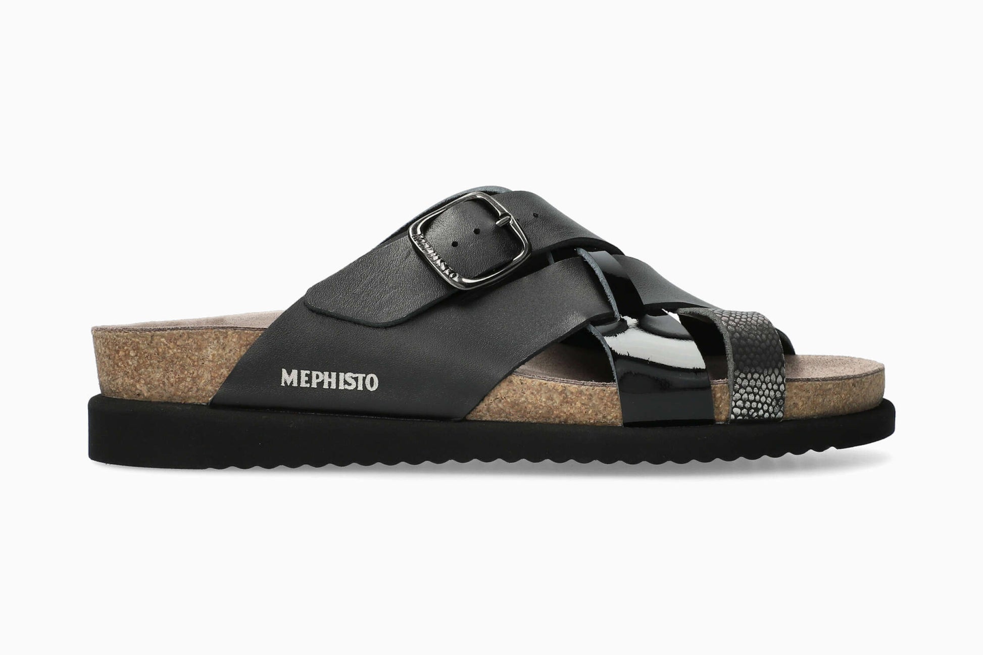 Easy to slip on and comfortable, our HIDA sandal will suit all your needs. This grey women's model is made of smooth leather over the entire foot with patent leather and metallic-effect leather inserts with a fantasy print.