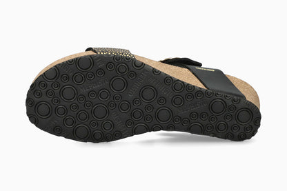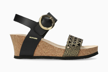 Feminine and perforated, this wedge-heeled sandal guarantees an ideal fit. The unique SOFT-AIR technology integrated into the cork arch ensures fatigue-free walking. AIR-RELAX technology respects the anatomy of the foot to prevent arch collapse. Hook-and-loop fastening with decorative buckle. This metallic-look model for women is made of fancy-print metallic-effect leather on the front of the foot and smooth leather on the back.