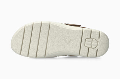 This casual sandal offers an excellent fit and optimum comfort. The removable insole with SOFT-AIR Technology and the SHOCK-ABSORBER in the outsole help reduce shock to a minimum for a smooth, fatigue-free walk. One of the special features of MOBILS shoes is their soft, comfortable INTEGRAL MATTRESSING. The hook-and-loop straps ensure quick, pressure-free fastening, adapting perfectly to the anatomy of the foot. The leather lining ensures healthy foot hygiene. This beige women's model is made from glittery metallic-effect leather on the front of the foot and suede leather on the back.