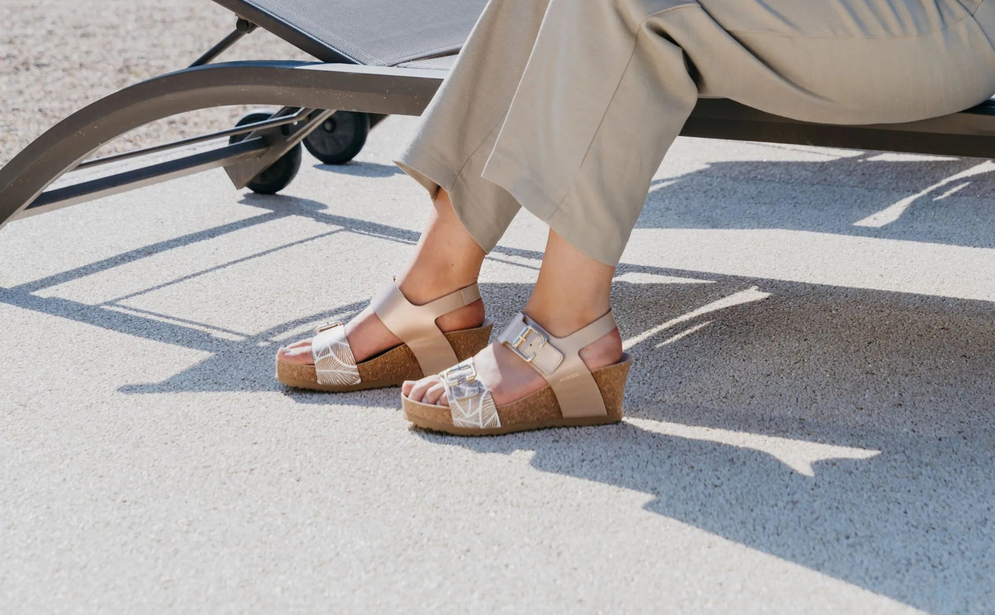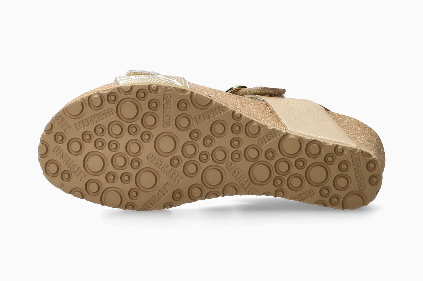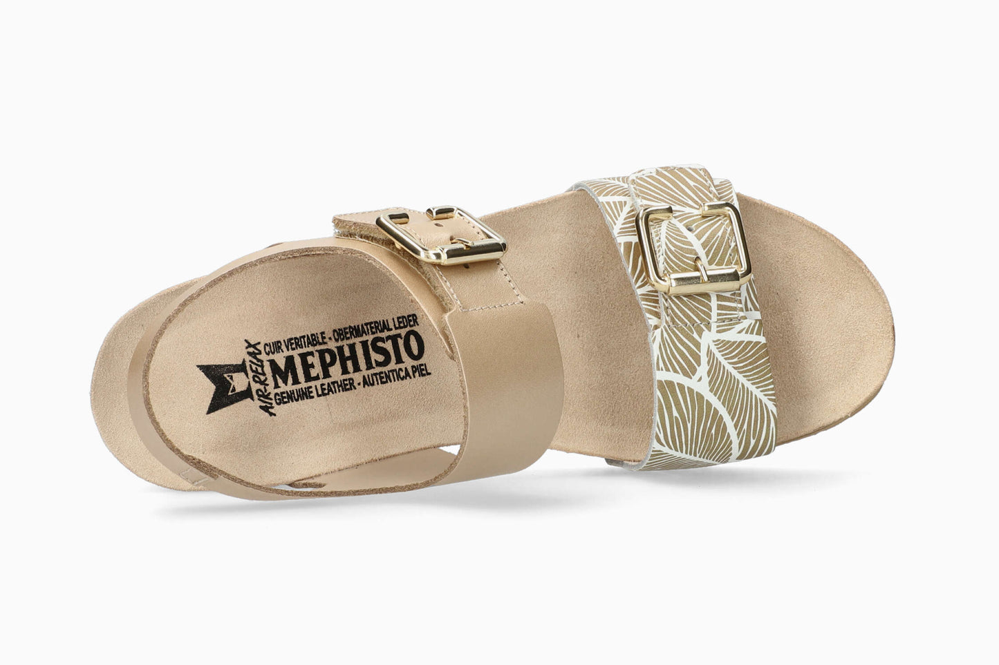Step boldly into timeless summer elegance with these iconic, platform wedge sandals. Designed for good times that last a long time, they blend eye-catching design with unmatched Mephisto comfort. This wedge boasts a carefully contoured footbed and a cork midsole that intelligently supports your foot’s anatomy for unparalleled all-day support. The beautiful, quality construction features wide, adjustable leather straps for great looks and a secure fit for every foot. Dance the night away, stroll by moonlight, or laugh and toast with friends – this sandal was meant to partake in life’s most wonderful moments. This women's metallic-look sandal combines matte metallic-effect leather and floral-print leather.