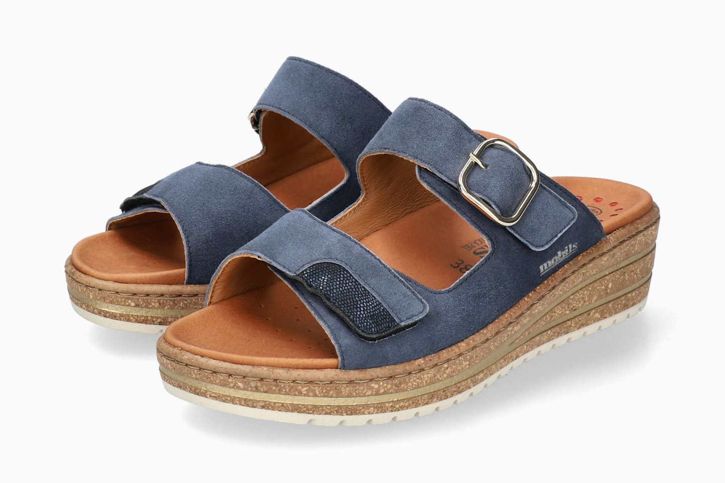 This sandal for women with a casual look provides a perfect feeling of well-being. The detachable insole, with integrated SOFT-AIR technology, and the outsole, equipped with SHOCK-ABSORBER, minimise impact and guarantee an effortless walk with a spring in your step. The INTEGRAL CUSHIONING ensures a perfect fit. The hook-and-loop straps allow quick and pressure-free closure, adapting perfectly to the anatomy of the foot. The leather lining ensures good foot hygiene. This blue model for women features suede leather all over the foot and glittery metallic-effect leather for a touch of whimsy.