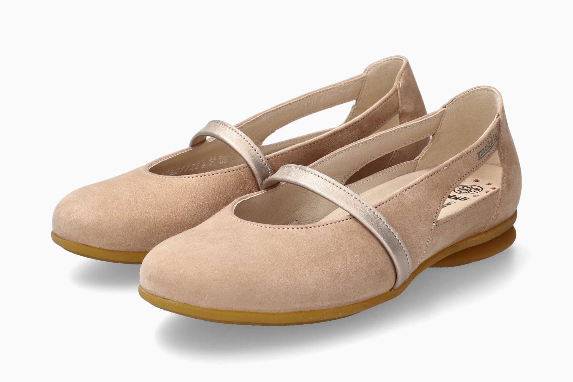 This lightweight, feminine ballerina with its supple rubber sole is timelessly elegant. The removable insole with SOFT-AIR technology and the outsole with SHOCK-ABSORBER reduce impact to a minimum, ensuring a smooth, fatigue-free walk. The INTEGRAL MATTRESSING provides a perfect fit. The leather lining ensures a healthy climate inside the shoe. This beige model for women is made from suede and metallic-effect leather.