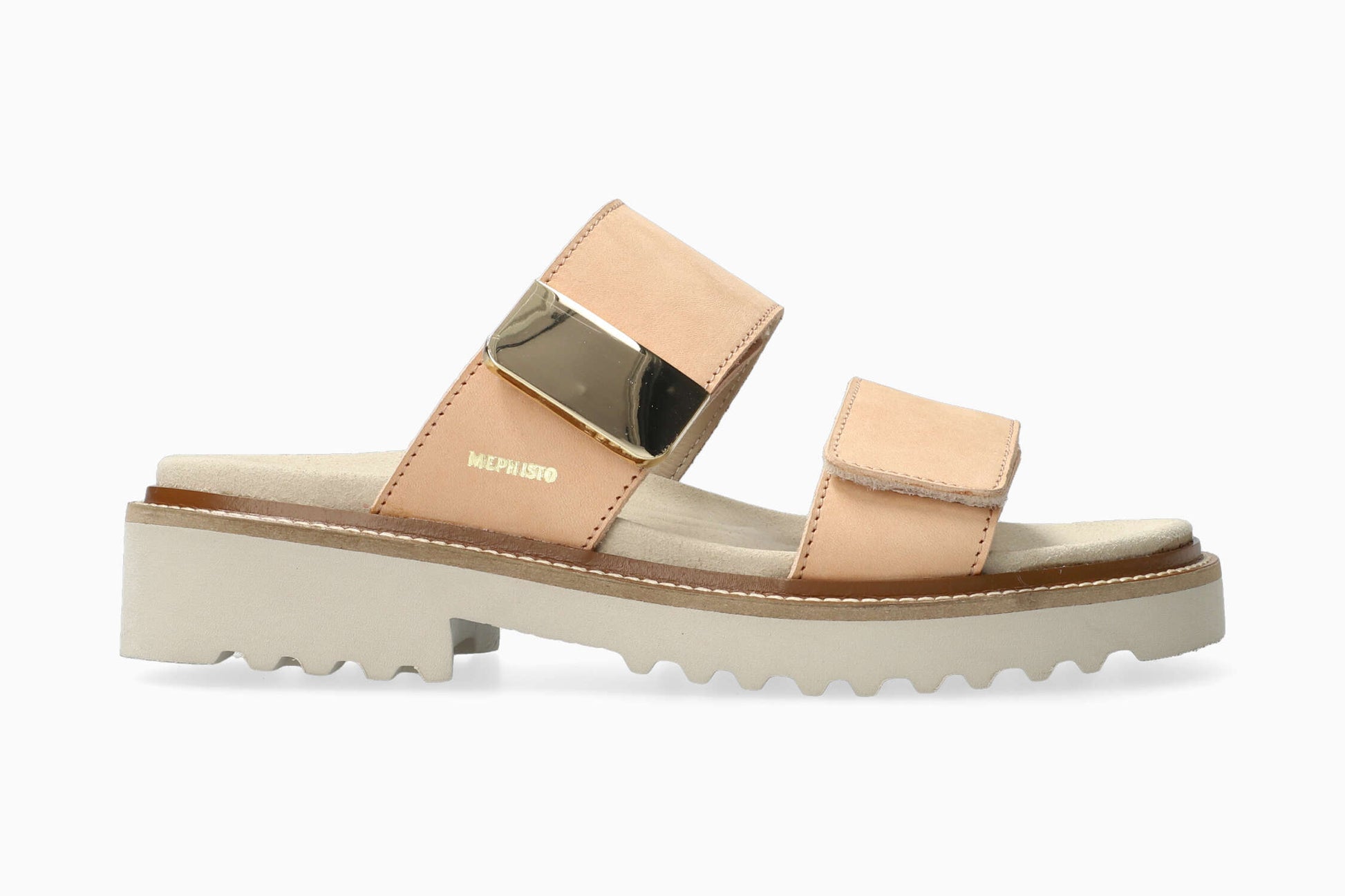 This sandal can be adapted to suit all styles and tastes. The SOFT-AIR midsole and SHOCK-ABSORBER integrated into the outsole reduce shock to a minimum for a smooth, fatigue-free walk. AIR-RELAX technology respects the anatomy of the foot to prevent arch collapse. They combine comfort with a perfect fit thanks to adjustable hook-and-loop straps, one of which is embellished with a metallic ornament for a touch of fantasy. The leather lining ensures a healthy climate inside the shoe. This sandal for women is made from nubuck leather.