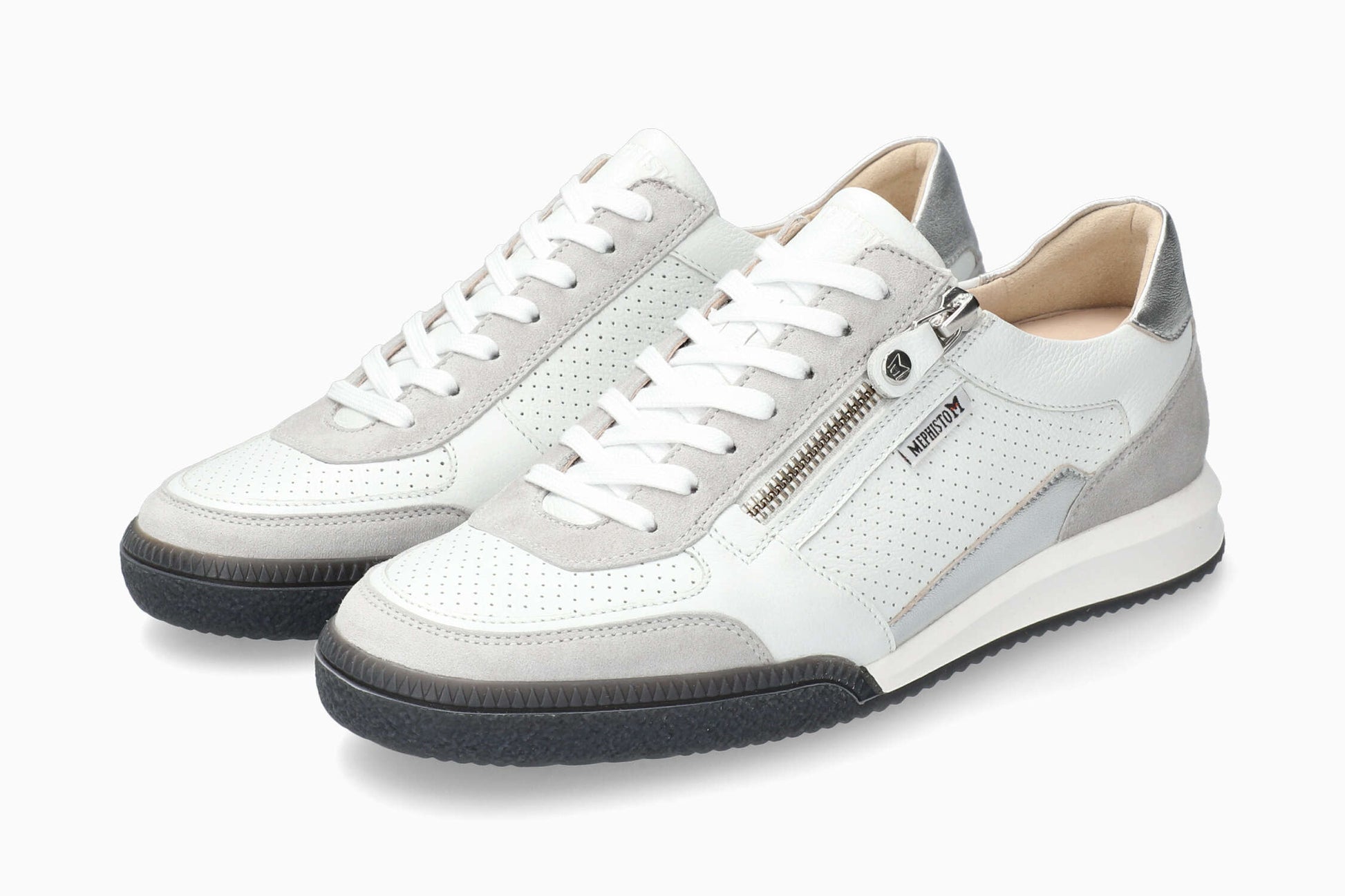 This sneaker has a sporty design with a very successful cut, offering an elegant and original look. The SOFT-AIR midsole and SHOCK-ABSORBER integrated into the outsole reduce shock to a minimum for a smooth, fatigue-free walk. AIR-RELAX technology respects the anatomy of the foot to prevent arch collapse. In addition to the lacing system, it's easy to put on thanks to its side zip. The leather lining ensures a healthy climate inside the shoe. This grey women's model is made from suede leather over the whole foot, with inserts in smooth grey grained leather and silver metallic-effect leather.