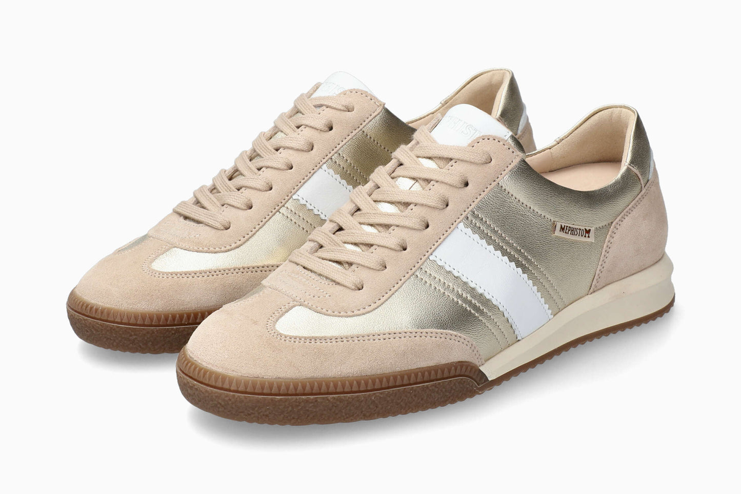 This sneaker has a sporty design with a very successful cut, offering an elegant and original look. The SOFT-AIR midsole and SHOCK-ABSORBER integrated into the outsole reduce shock to a minimum for a smooth, fatigue-free walk. AIR-RELAX technology respects the anatomy of the foot to prevent arch collapse. This lace-up sneaker has a leather lining, a high-grip outsole and excellent cushioning. The leather lining provides a healthy climate inside the shoe. This beige model for women features suede leather all over the foot and touches of gold metallic-effect leather and smooth white leather.
